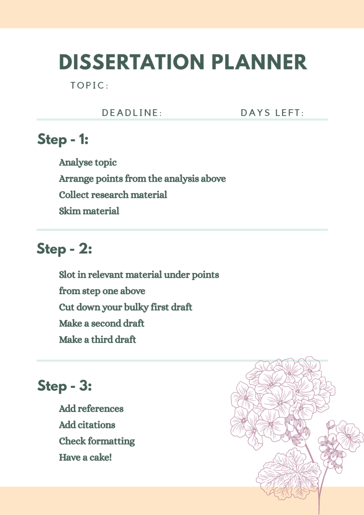 - It has a topic line, deadline space and also place to see how many days you have left to complete the dissertation.